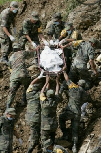 Military transport the body of a mudslide victim in San Miguel Eloxochitlan, Mexico, Thursday, July 5, 2007. Rescuers digging through mud and rocks have recovered at least 14 bodies from a bus carrying 40 to 60 passengers which was buried on a rural road after a mountainside gave way on July 4, 2007. (AP Photo/Eduardo Verdugo)