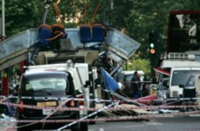 File photo showing the severely damaged double-decker bus after a terrorist attack in London on 7 July 2005. AP Photo/Sang Tan, File