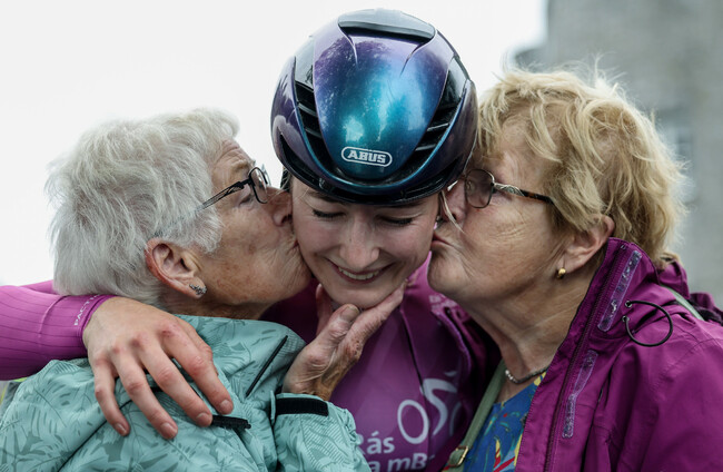 Rás na mBan champion Mia Griffin is congratulated by her grandmothers Joan Caulfield and Breda Griffin. Lorraine O'Sullivan