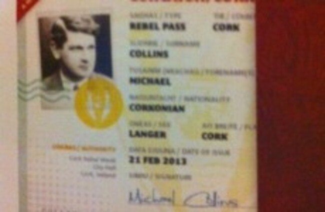 The Rebel Week mock-up passport for Michael Collins uses an image of the leader and in the section that describes Collins’ gender it states “langer”.