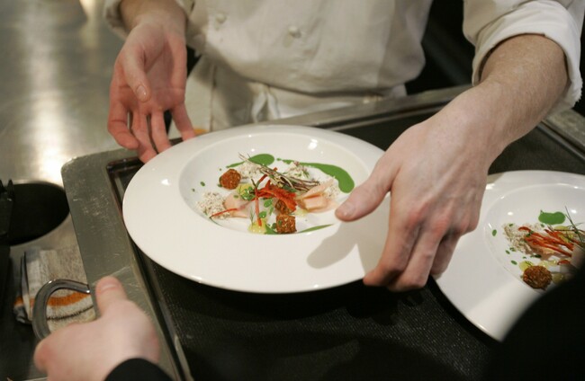 Chef Grant Achatz places one of the many courses on a server's tray in the Alinea restaurant kitchen in Chicago. AP/Press Association Images