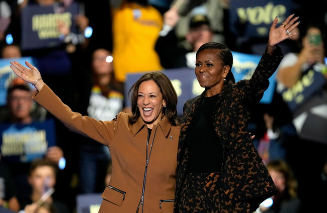 Democratic presidential nominee Vice President Kamala Harris and former first lady Michelle Obama arrive to speak at a campaign rally in Michigan. Alamy Stock Photo