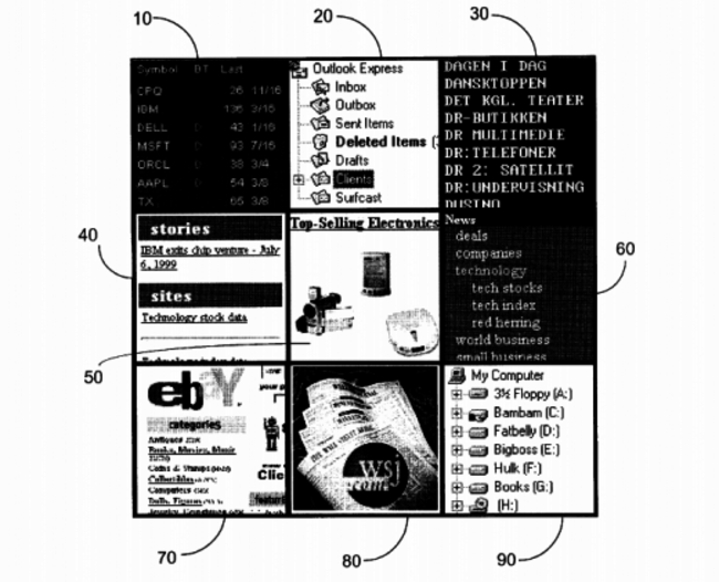 SurfCast describes its “Tiles” as ”dynamically updating icons,” different from standard operating-system icons for files and applications because they are “selectable and live—containing refreshed content that provides a real-time or near-real-time view of the underlying information.” That’s Patent 6,724,403, granted in 2004: “System and method for simultaneous display of multiple information sources.”