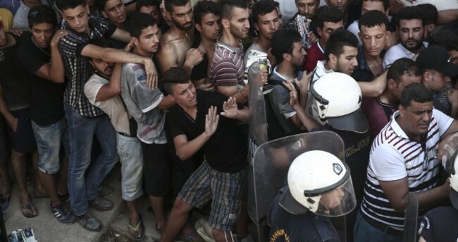 Greece Refugee Crisis Police officers try to make space as migrants queuing for a registration procedure inside a stadium in Kos Associated Press Associated Press