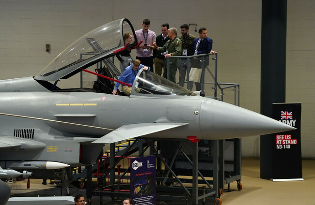 A number of delegates, not from Ireland, at the DSEI event in London viewing a British fighter jet display. Alamy Stock Photo