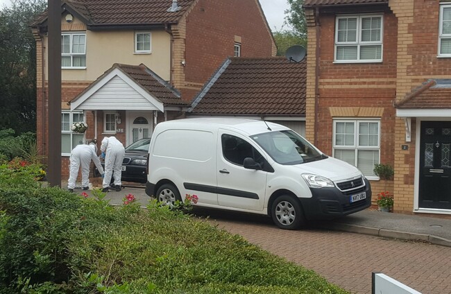 Two forensic officers could be seen inspecting an object on the driveway next to a black BMW.