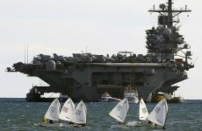 Sail boats pictured beside the American aircraft carrier USS George HW Bush outside Piraeus port in Greece. AP/Press Association Images