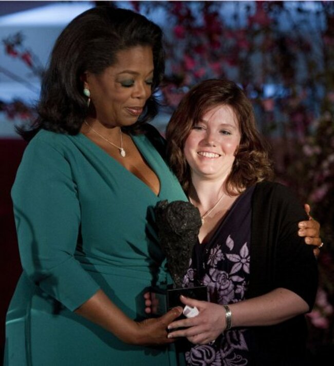 March 9, 2012, Oprah Winfrey presents Jaycee Dugard with a DVF Award at The Third Annual DVF Awards held at the United Nations in New York. Pic: AP Photo/Charles Sykes