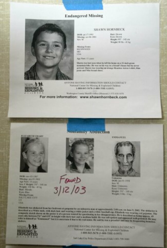 The missing child flier for Elizabeth Smart hangs next to the one for Shawn Hornbeck. Hornbeck and Smart were both found alive. (AP Photo/Tom Gannam)