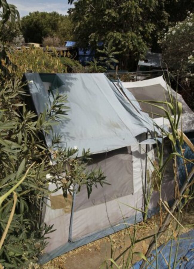 A tent is set up in the far backyard of a home in Antioch, California, where authorities say Dugard lived. Pic: AP Photo/Paul Sakuma