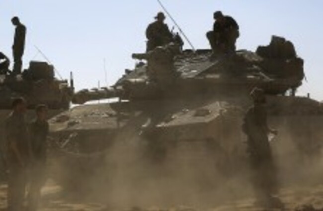 Israelis soldiers gather in a staging area near the Israel Gaza border yesterday. AP Photo/Tsafrir Abayov