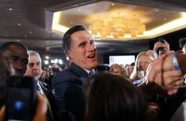 Mitt Romney greets supporters at his election night party in Boston, after taking victory in six of the 10 states which voted on Super Tuesday. Gerald Herbert/AP