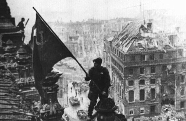 A Soviet soldier holding the national flag atop the Reichstag in Berlin in 1945 AP/Press Association Images