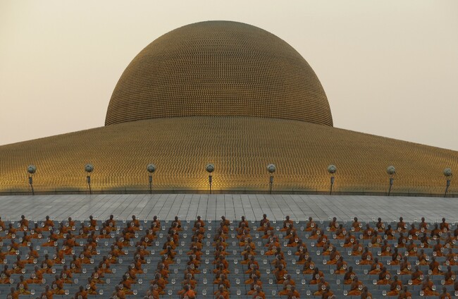 Thai Buddhist monks pray and gather at Wat Dhammakaya temple. Sakchai Lalit