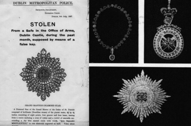 Called the “Irish Crown Jewels”, the jewelled regalia of the Order of St Patrick were stolen from Dublin Castle in 1907, along with the collars of the five knights of the Order. The jewels have never been recovered, and the thief never caught.