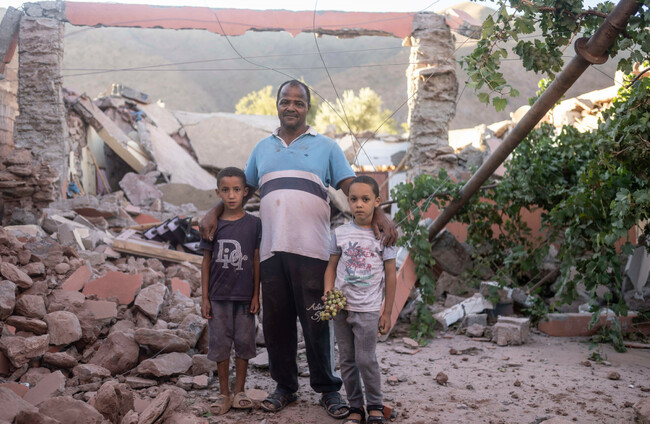 Mohammed Elhmatif and sons amidst the rubble of their home in Ijjoukak village, near Marrakech. Alamy Stock Photo