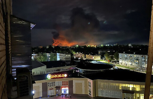 Smoke billowing over the Russian city of Pskov following a similar drone attack earlier this week AP