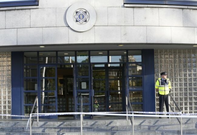Garda on duty outside Store Street Garda Station earlier after a man had been seriously injured in a shooting in Dublin. Pic: Sasko Lazarov/Photocall Ireland
