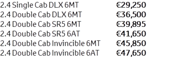 Irish buyers get a choice of single cab or double cab body styles and three trim levels; DLX, SR5 and Invincible.