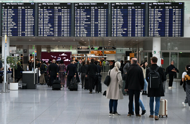 Passengers stand in front of a display board in Terminal 2 at Munich Airport. Alamy Stock Photo