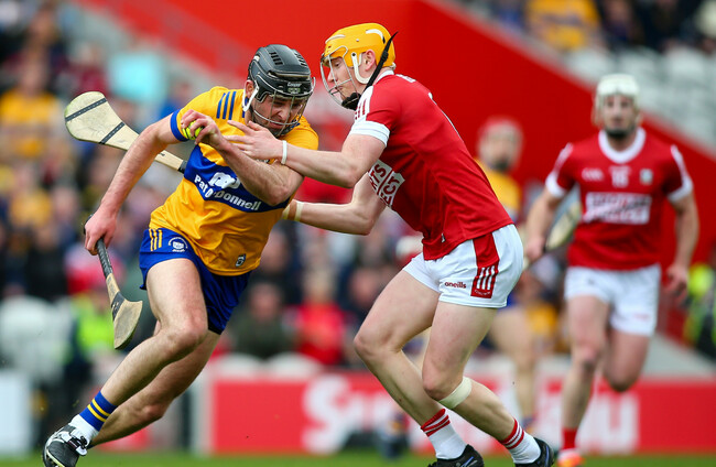 Clare's Cathal Malone and Cork's Shane Barrett. Ken Sutton/INPHO
