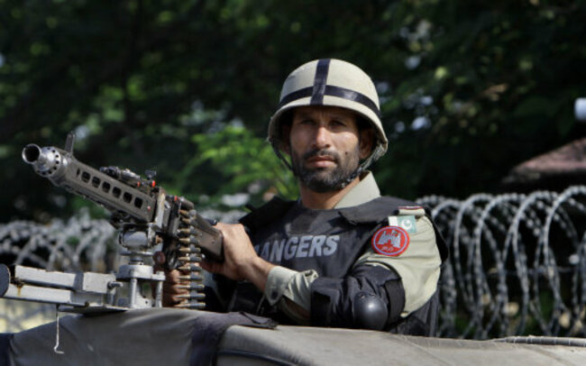 (Pakistani paramilitary soldier stands alert outside an anti terrorism court where former President and army chief Pervez Musharraf appeared. Pic: Anjum Naveed/AP/PA Images)