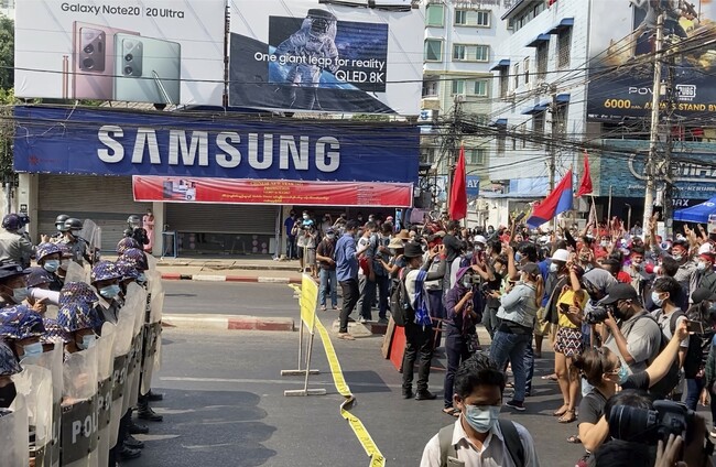 Riot police block the road to prevent protesters from marching forward in capital Yangon
