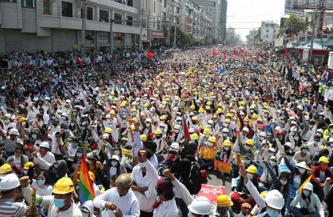 PROTESTERS HAVE GATHERED in Myanmar’s biggest city despite the ruling junta’s threat to use lethal force against people who join a general strike against the military’s takeover three weeks ago.