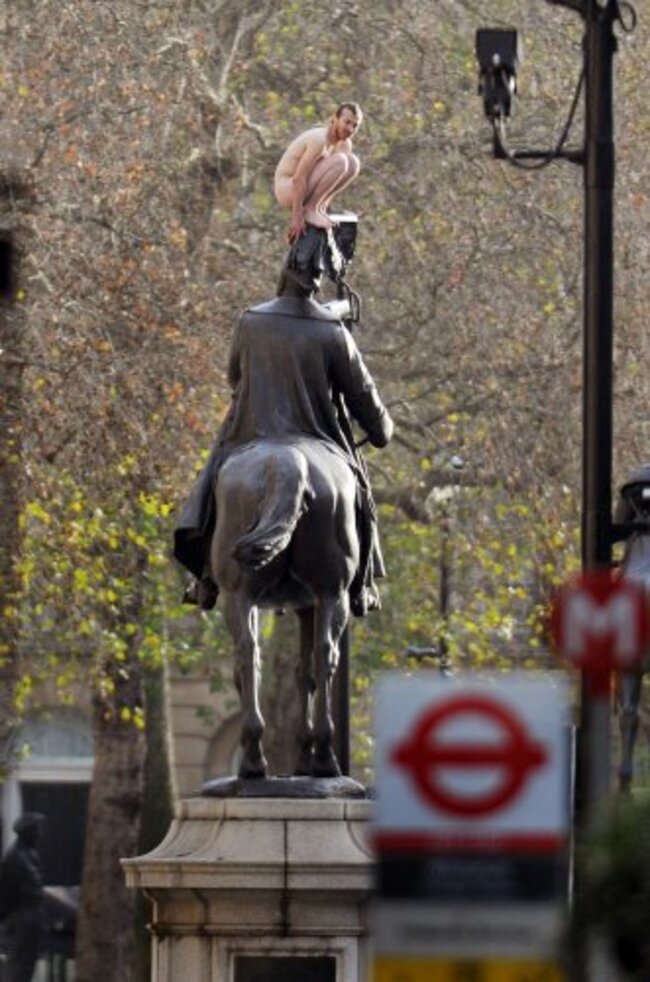Sky News said that part of the street near the Ministry of Defence building was closed off after police received reports of the naked man climbing up onto the large statue and removing his clothes.