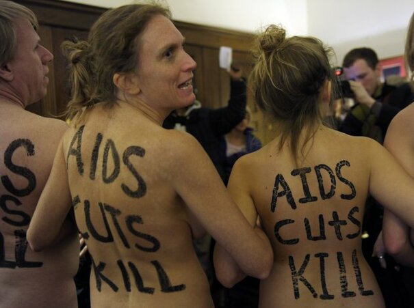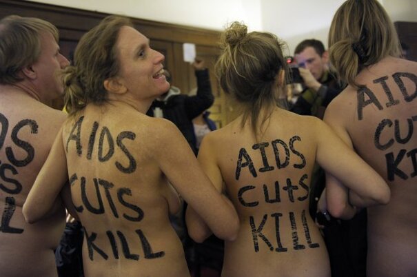 The demonstrators said they wanted to articulate the “naked truth” about the impact of cuts to AIDS prevention and treatment programmes.