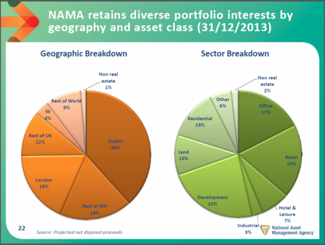 This slide, also taken from the presentation, shows that the majority of the real estate still owned by NAMA is in Dublin. Some 18 per cent is scattered throughout the rest of the country, with the same amount in London.