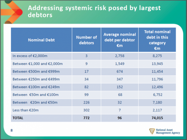 Meanwhile the remaining 586 borrowers accounting for the other €13 billion of debt were managed through the participating banks, with NAMA feeding into the process.