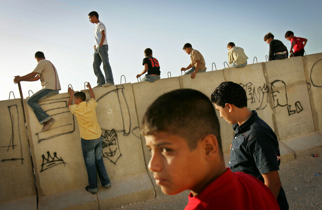Palestinian boys at a concrete wall in Anata, Jerusalem, Palestine. Alamy Stock Photo