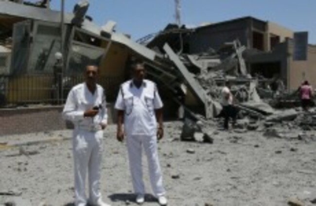 Libyan police officers stand next to a destroyed building what officials said was a NATO airstrike at a hotel, in the capital Tripoli today Ivan Sekretarev/AP/Press Association Images