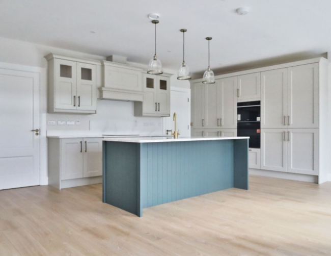 At the heart of each home lies a beautifully appointed kitchen designed to be both practical and sociable. Solid oak cabinetry, painted in a sophisticated taupe, is paired with a statement centre island in sage willow green making for a striking yet harmonious contrast. Quartz worktops and matching upstands provide a sleek, durable finish, while a suite of high quality kitchen appliances ensures everyday tasks are handled with ease.