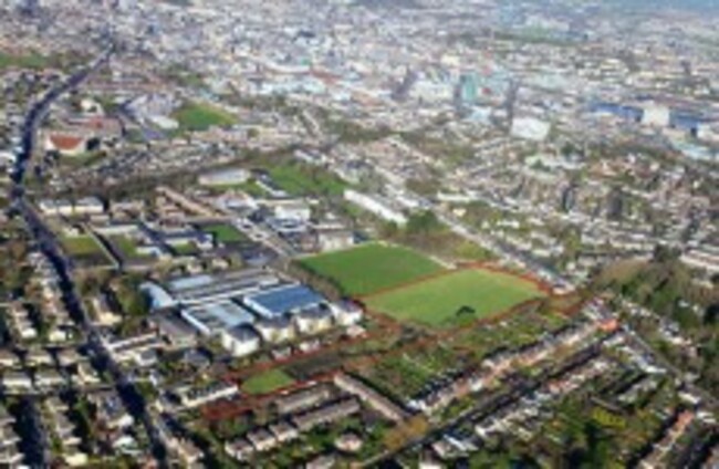 An aerial shot for the former Nemo Rangers site up for sale (outlined in red) Savills Cork