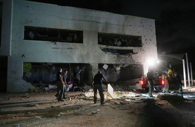 Israeli police work at a damaged school building that was hit by missiles fired from Iran in Gadera, Israel. Alamy Stock Photo
