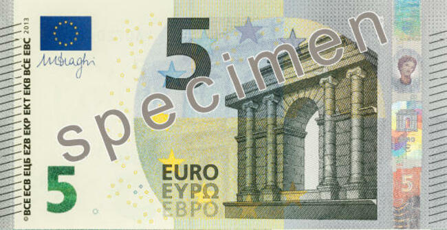 The new notes includes Europa’s image in their watermark and on its hologramic strip, and will also feature an emerald-coloured ’5′ in its corner which changes colour from green to blue when tilted under light.