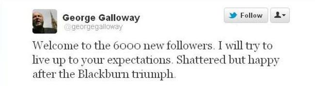 THE NEWLY-ELECTED MP for Bradford West George Galloway took to Twitter this morning to celebrate his election success but mistakenly referred to the city of Blackburn in one of his tweets instead of Bradford.