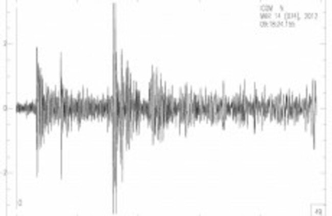 The Co Clare seismometer's reading of this morning's earthquake in Japan, which occurred 5,762 miles away. Irish National Seismic Network