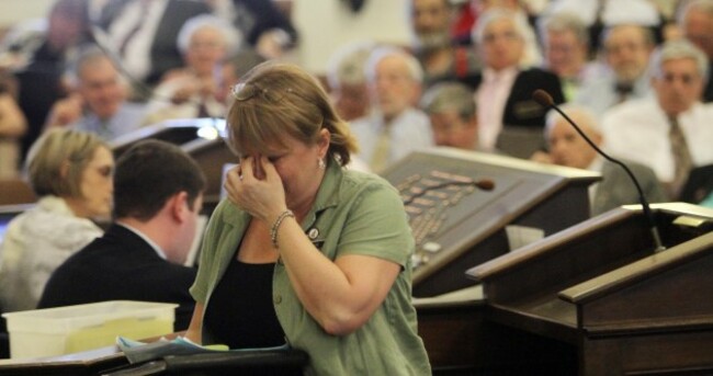 State representative Tammy Sommons covers her face after lawmakers rejected a bill which would have overturned previous laws allowing gay marriage. AP Photo/Jim Cole