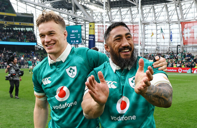 Josh van der Flier and Bundee Aki celebrate have signed new IRFU deals. ©INPHO