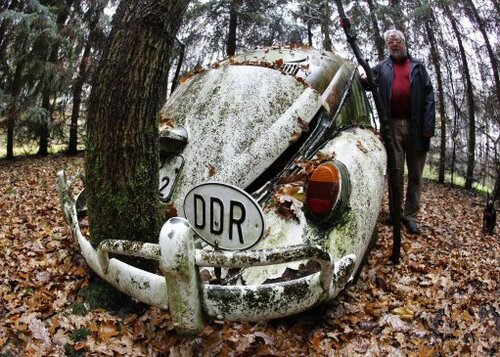 A 48-year-old Beetle with a plate of former East Germany is seen in the garden of Otto Weymann near Kassel, central Germany - he bought the car in 1989 from two East Germans who had just passed the nearby border between East and West Germany when the Wall came down. Weymann planted trees in the front and back of the car.