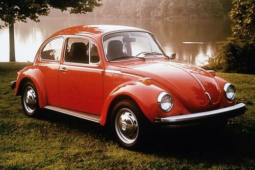 A vintage Volkswagen Beetle in this old promotional shot from Volkswagen of American.