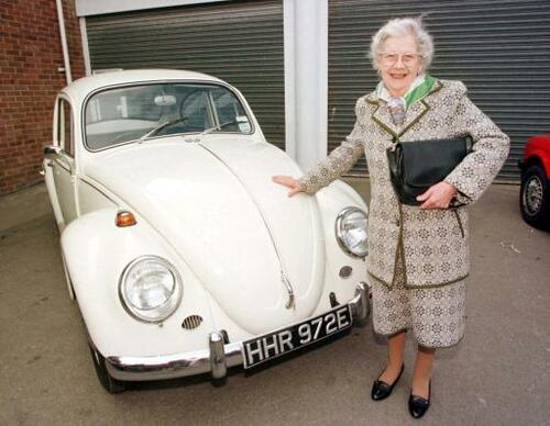 Miss Phyllis Harding, 80, with her 30-year-old Volkswagen Beetle in Salisbury, England - she bought it new in February 1967 and it has only 3485 miles on the clock.