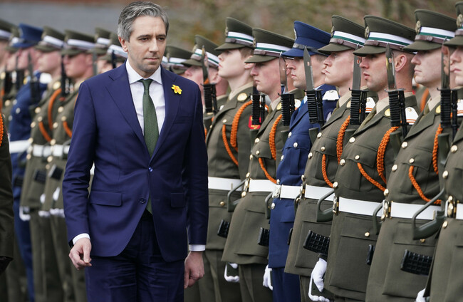 Tanaiste and Minister for Defence Simon Harris inspects a guard of honour as he attends the commissioning ceremony of the 100th cadet class & the 12th potential officers class, at the Defence Forces Training Centre, in Curragh, Co Kildare in March. Alamy Stock Photo