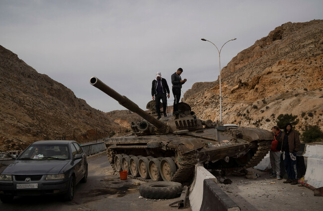 Syrians stand on the top of a government forces tank that was left on a road, on their way to Damascus, Syria, Wednesday, 11 December. Alamy