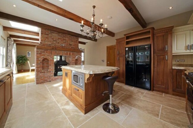 The kitchen/living/dining room runs the full width of the house and the kitchen has a Stanley stove, marble counter tops, a centre island, integrated appliances and a wood-burning stove.