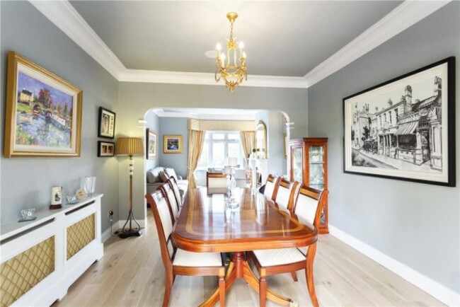 There are two interconnected formal reception rooms on the ground floor and a separate playroom. The reception rooms have marble-surround fireplaces and laminate flooring.