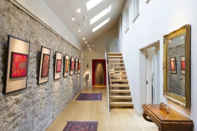 The living room is double height and has a mezzanine corridor leading to the upstairs rooms, lined with built-in floor to ceiling bookshelves.